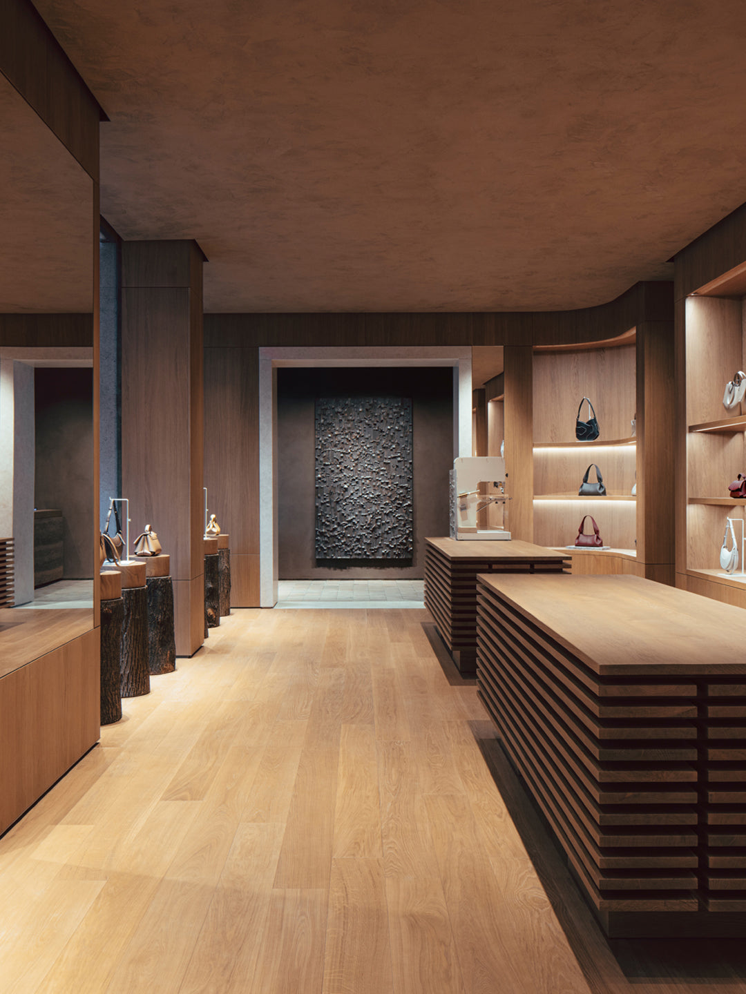 Designed by the Danish studio Norm Architects, the store is a sensory journey. The enfilade unfolds along a gradient color palette, progressing from very light to much darker tones. Each material evolves in color and texture, from raw to refined, reflecting Polène’s desire to explore matter in all of its guises and create a palpable rhythm throughout the store.
